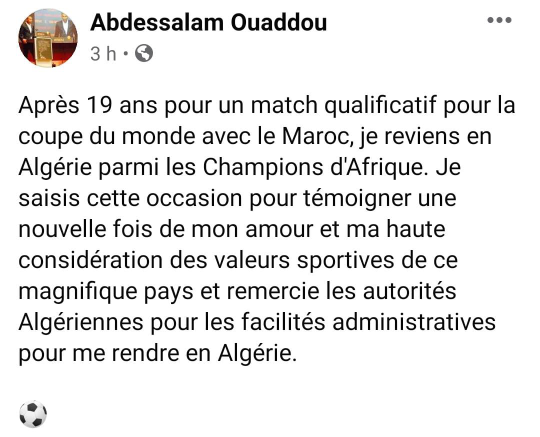 بعد دعم عبد السلام وادو لترشيح خير الدين زطشي الذي كان ينافس فوزي لقجع على عضوية الاتحاد الدولي لكرة القدم،  ينشر صباح هذا اليوم خبر عودته إلى الجزائر، ويشكر مسؤوليتها وسلطاتها على تسهيل الأمور الإدارية، في خطوات غير بريئة.