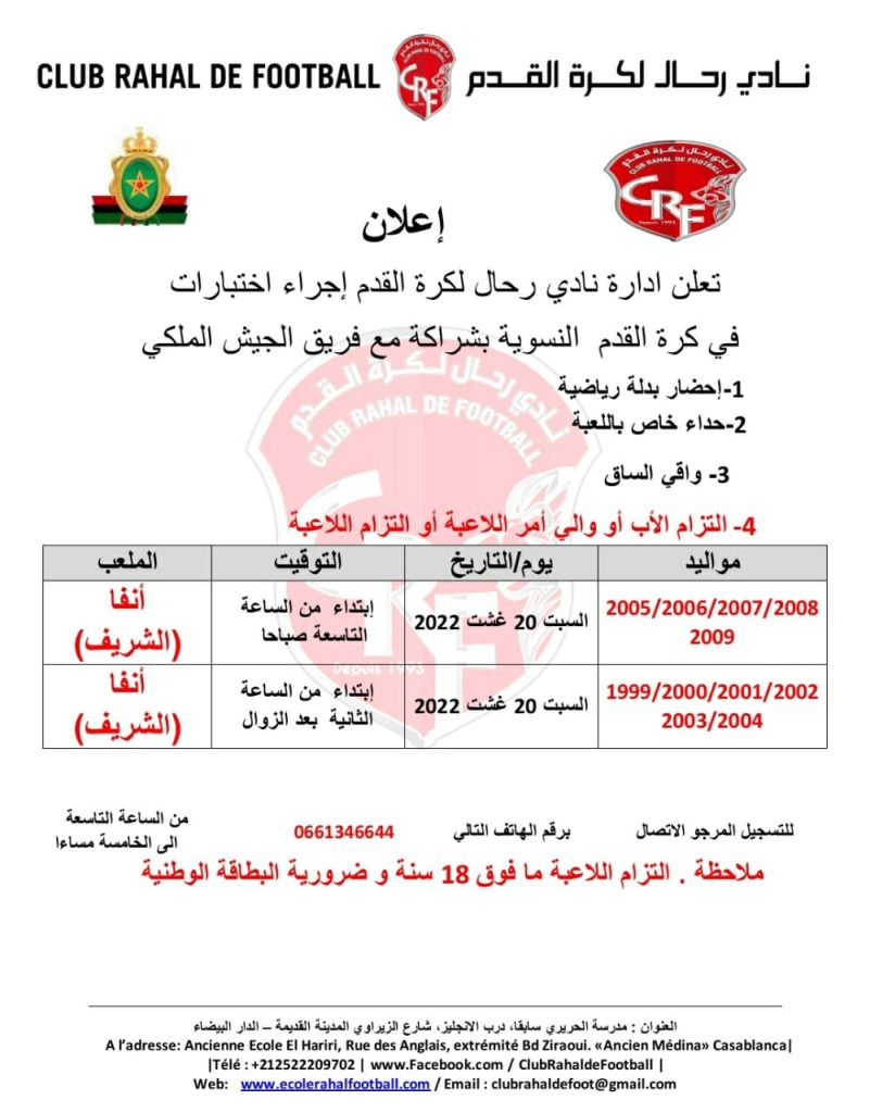 أعلنت إدارة نادي رحال لكرة القدم عن إجراء اختبارات في كرة القدم النسوية بشراكة مع فريق الجيش الملكي.