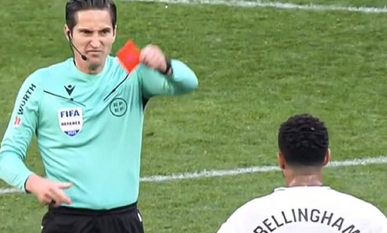 تعرض الانجليزي جود بيلينغهام لاعب ريال مدريد لطرد من مباراة أوساسونا في الشوط الأول عند الدقيقة 40 بعد محادثة واعتراض على حكم اللقاء.